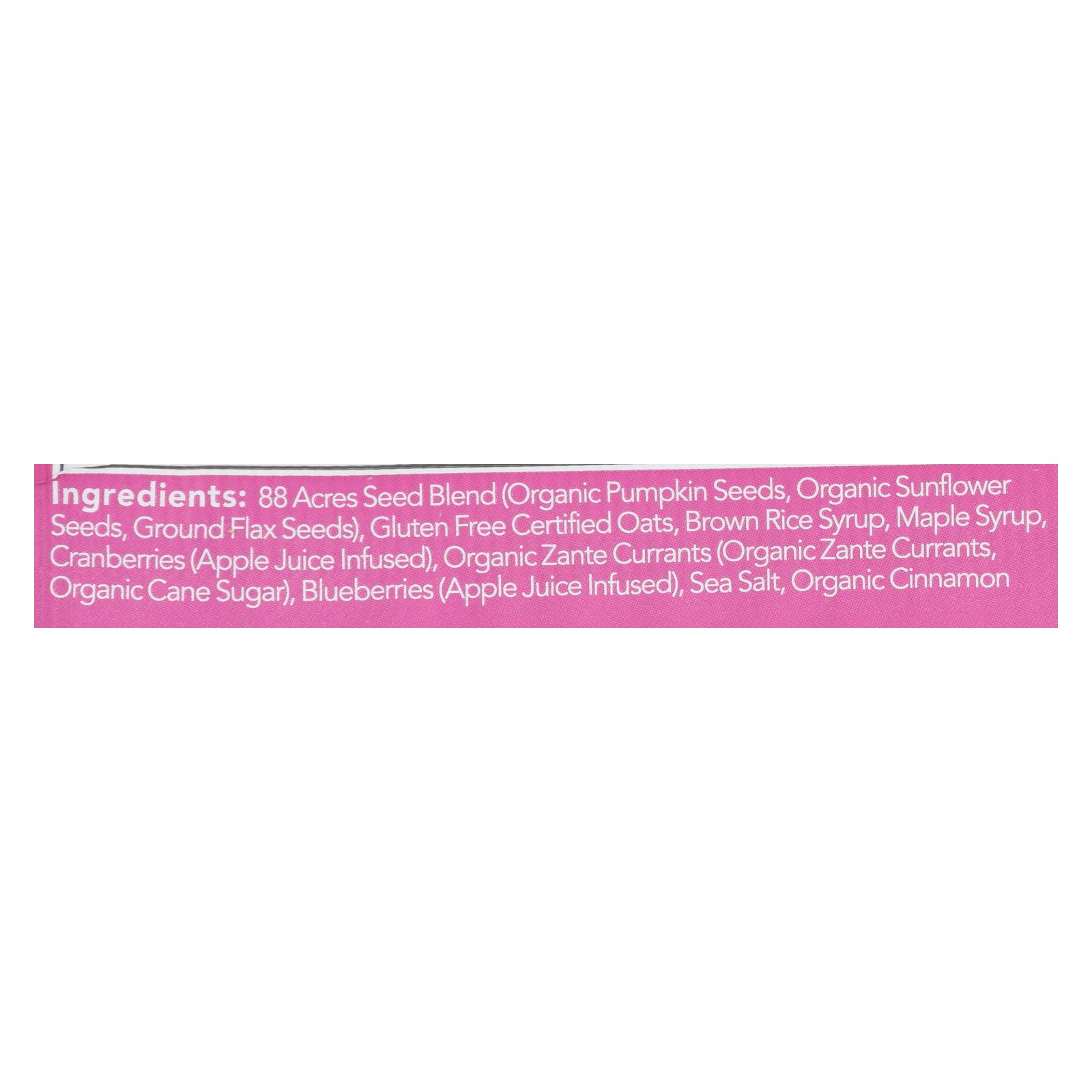 ingredients : 88 acres seed blend;organic pumpkin seeds;organic sunflower seeds;ground flax seeds;gluten free certified oats;brown rice syrup;maple syrup;cranberries;apple juice infused;organic zante currants;organic cane sugar;blueberries;sea salt;organic cinnamon