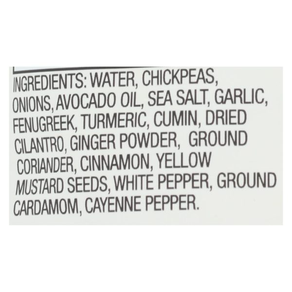 ingredients : water;chickpeas;onions;avocado oil;sea salt;garlic;fenugreek;turmeric;cumin;dried cilantro;ginger powder;ground coriander;cinnamon;yellow mustard seeds;white pepper;ground cardamom;cayenne pepper