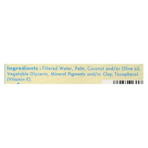 ingredients : : filtered water;palm;coconut and/or olive oil;vegetable glycerin;mineral pigments and/or clay;tocopherol;vitamin e