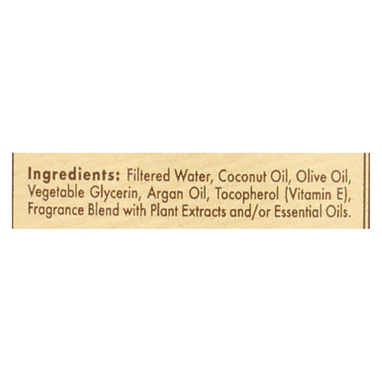 ingredients : filtered water;coconut oil;olive oil;vegetable glycerin;argan oil;tocopherol;vitamin e;fragrance blend with plant extracts and/or essential oils