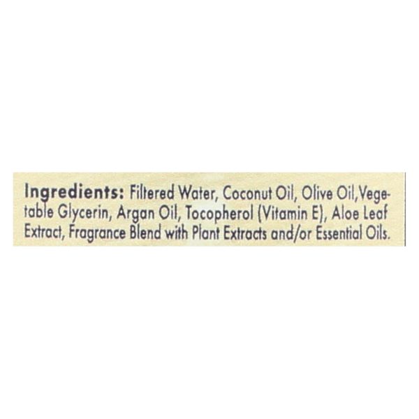 ingredients : filtered wafer;coconut oil;olive oil;vegetable glycerin;argan oil;tocopherol;vitamin e;aloe leaf extract fragrance blend with plant extracts and/or essential oils