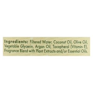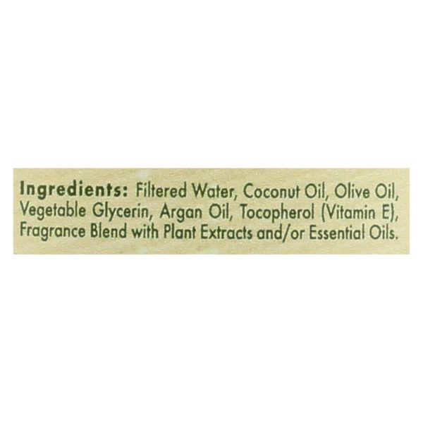 ingredients : filtered water;coconut oil;olive oil;vegetable glycerin;argan oil;tocopherol;vitamin e;fragrance blend with plant extracts and/or essential oils