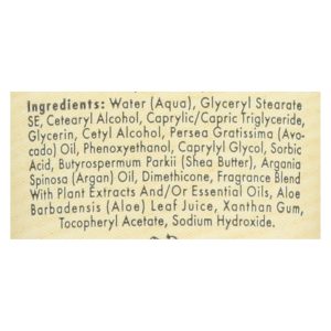 ingredients : water;aqua;glyceryl stearate se;cetearyl alcohol;caprylic/capric triglyceride;glycerin;cetyl alcohol;persea gratissima;avocado;oil;phenoxyethanol;caprylyl glycol;sorbic acid;butyrospermum parkii;shea butter;argania spinosa;argan;dimethicone;fragrance blend with plant extracts and/or essential oils;aloe barbadensis;aloe;leaf juice;xanthan gum;tocopheryl acetate;sodium hydroxide