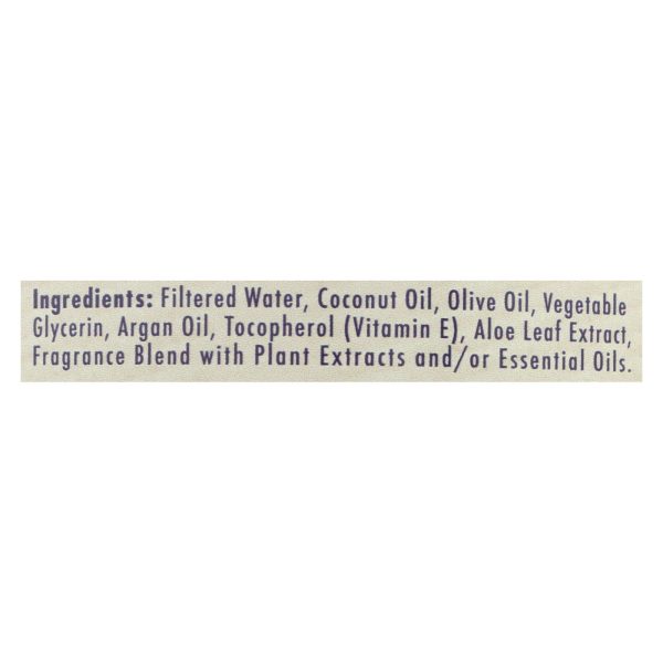ingredients : filtered water;coconut oil;olive oil;vegetable glycerin;argan oil;tocopherol;vitamin e;aloe leaf extract;fragrance blend with plant extracts and/or essential oils