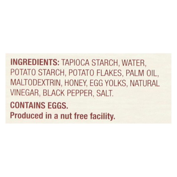 ingredients : tapioca starch;water;potato starch;potato flakes;palm oil;honey;egg yolks;natural vinegar;black pepper;salt