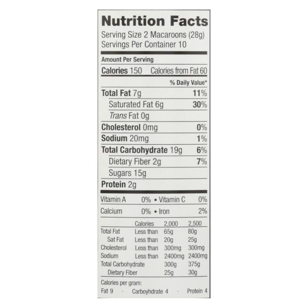 Absolutely gluten free – classic coconut toasted coconut macaroons satisfy your sweet tooth with an all-natural recipe. The soft cookies are delightfully chewy and contain only 75 calories per macaroon. Enjoy them with a cup of coffee or as a midday snack. One canister contains 10 oz. Of gluten free toasted coconut macaroons.