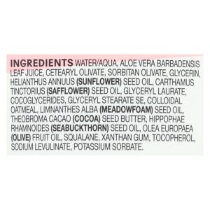 ingredients : water/aqua;aloe vera barbadensis leaf juice;cetearyl olivate;sorbitan olivate;glycerin;helianthus annuus;sunflower;seed oil;carthamus tinctorius;safflower;glyceryl laurate;cocoglycerides;glyceryl stearate se;colloidal oatmeal;limnanthes alba;meadowfoam;theobroma cacao;cocoa;seed butter;hippophae rhamnoides;seabuckthorn;olea europaea;olive;fruit oil;squalane;xanthan gum;tocopherol;sodium levulinate;potassium sorbate