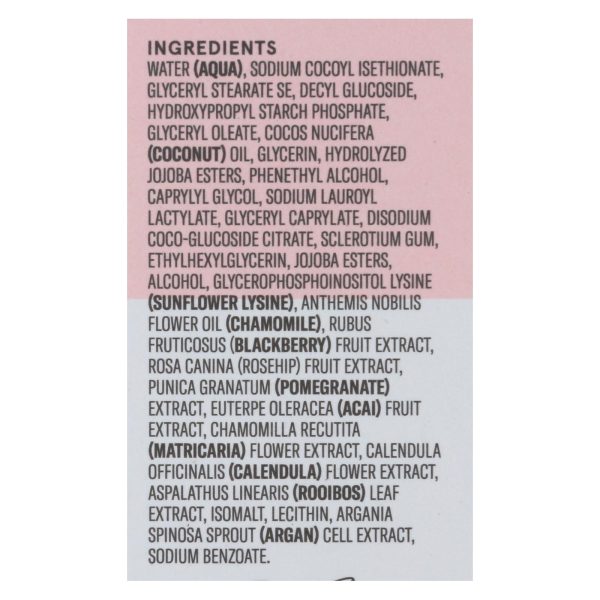 ingredients : water;aqua;sodium cocoyl isethionate;glyceryl stearate se;decyl glucoside;hydroxypropyl starch phosphate;glyceryl oleate;cocos nucifera;coconut;oil;glycerin;hydrolyzed jojoba esters;phenethyl alcohol;caprylyl glycol;sodium lauroyl lactylate;glyceryl caprylate;disodium coco-glucoside citrate;sclerotium gum;ethylhexylglycerin;jojoba esters;alcohol;glycerophosphoinositol lysine;sunflower lysine;anthemis nobilis flower oil;chamomile;rubus fruticosus;blackberry;fruit extract;rosa canina;rosehip;punic