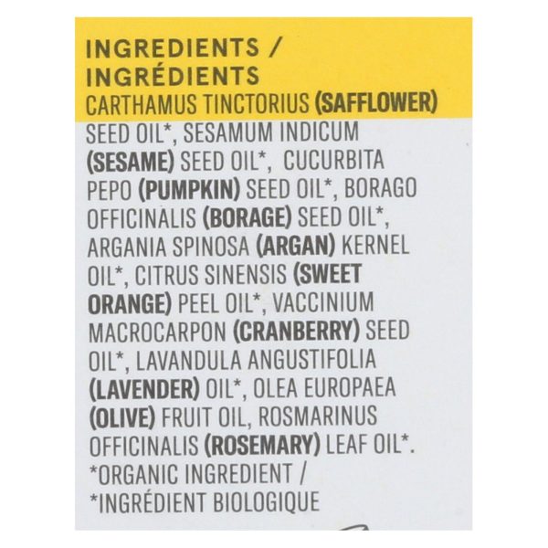ingredients : carthamus tinctorilis;safflower;seed oil;sesamum indicum;sesame;cucurbita pepo;pumpkin;borago officinalis;borace;argania spinosa;argan;kernel oil;citrus sinensis;sweet orange;peel oil;vaccinium macrocarpon;cranberry;lavandula angustifolia;lavender;oil;olea europaea;olive;fruit oil;rosmarinus officinalis;rosemary;leaf oil