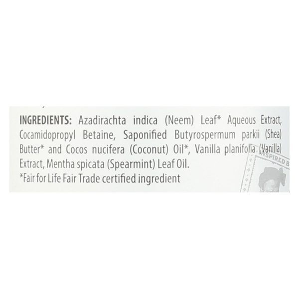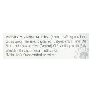 ingredients : azadirachta indica;neem;leaf aqueous extract;saponifed butyrospermum parkii;shea;butter and cocos nucifera;coconut;oil;coco-retaine;vanilla planifolia;vanilla;extract;mentha spicata;spearmint;leaf oil