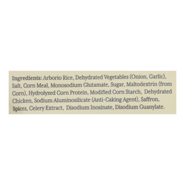 ingredients : arborio rice;dehydrated vegetables;onion;garlic;salt;corn meal;monosodium glutamate;sugar;maltodextrin;from corn;hydrolyzed corn protein;modified corn starch;dehydrated chicken;sodium aluminosilicate;anti-caking agent;saffron;spices;celery extract;disodium inosinate;disodium guanylate