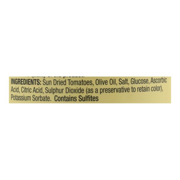 ingredients : sun dried tomatoes;olive oil;salt;glucose;ascorbic acid;citric acid;sulphur dioxide;as a preservative to retain color;potassium sorbate
