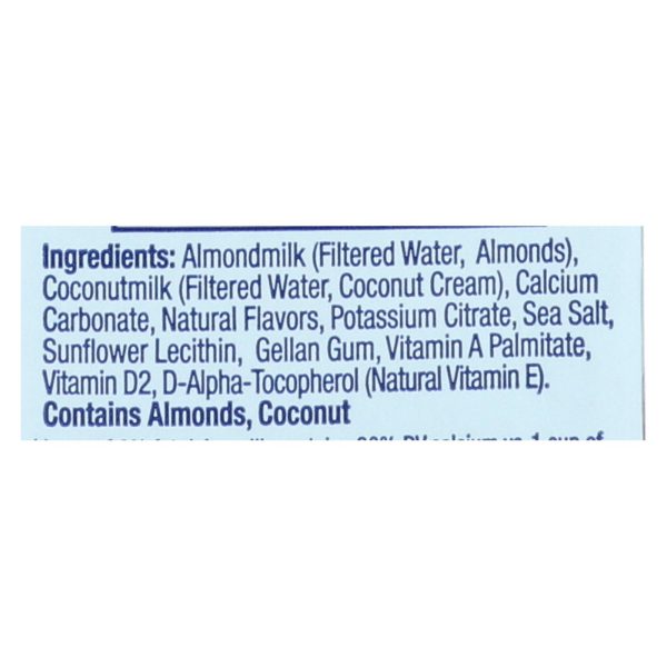 ingredients : almondmilk;filtered water;almonds;coconutmilk;coconut cream;calcium carbonate;natural flavors;potassium citrate;sea salt;sunflower lecithin;gellan gum;vitamin a palmitate;vitamin d2;d-alpha-tocopherol;natural vitamin e