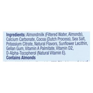 ingredients : almondmilk;filtered water;almonds;calcium carbonate;cocoa;dutch process;sea salt;potassium citrate;natural flavors;sunflower lecithin;gellan gum;vitamin a palmitate;vitamin d2;d-alpha-tocopherol;natural vitamin e
