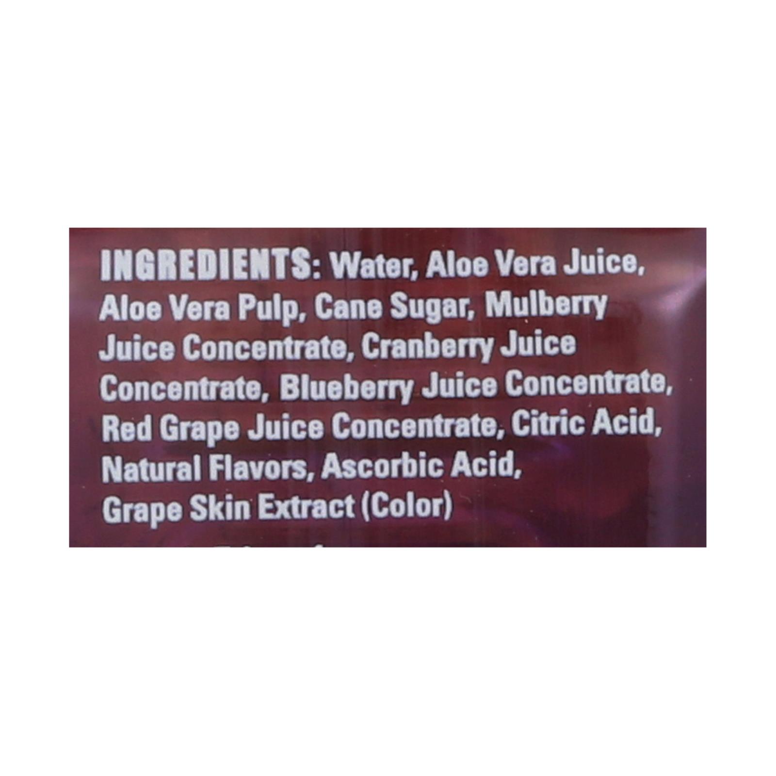 ingredients : purified water;aloe vera juice;aloe vera pulp;cane sugar;mix berry juice (blueberry juice, cranberry juice, red grape juice, white grape juice, yumberry juice, mulberry juice);red grape juice;apple juice;natural flavors;citric acid;calcium lactate;ascorbic acid;grape skin extract (color)