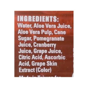 ingredients : purified water;aloe vera juice;aloe vera pulp;cane sugar;pomegranate juice;cranberry juice;grape juice;citric acid;natural flavors;ascorbic acid;calcium lactate;grape skin extract (color)