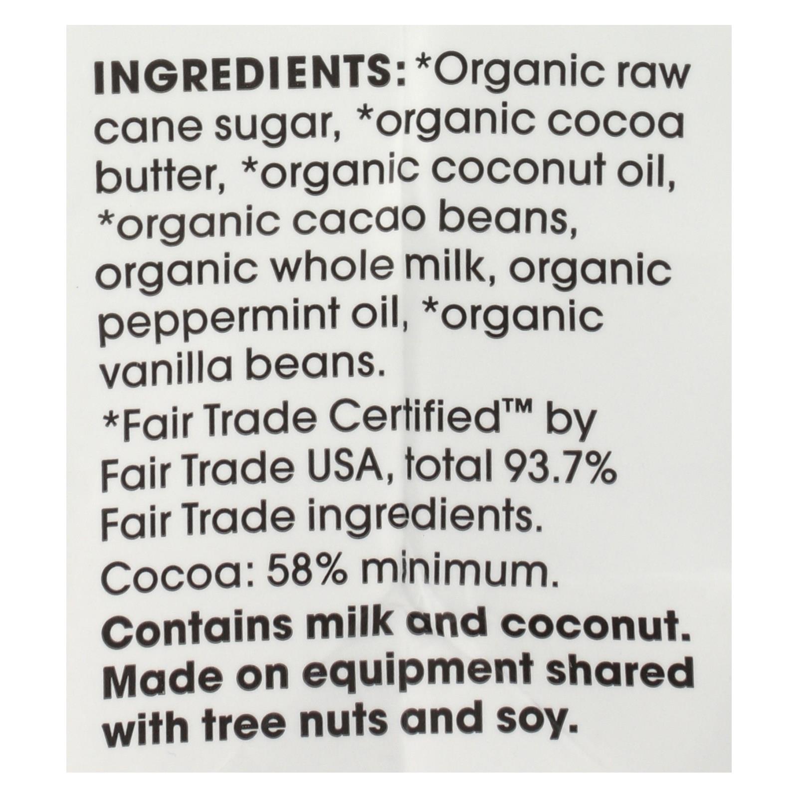 ingredients : organic raw cane sugar;organic cocoa butter;organic coconut oil;organic cacao beans;organic whole milk;organic peppermint oil;organic vanilla beans