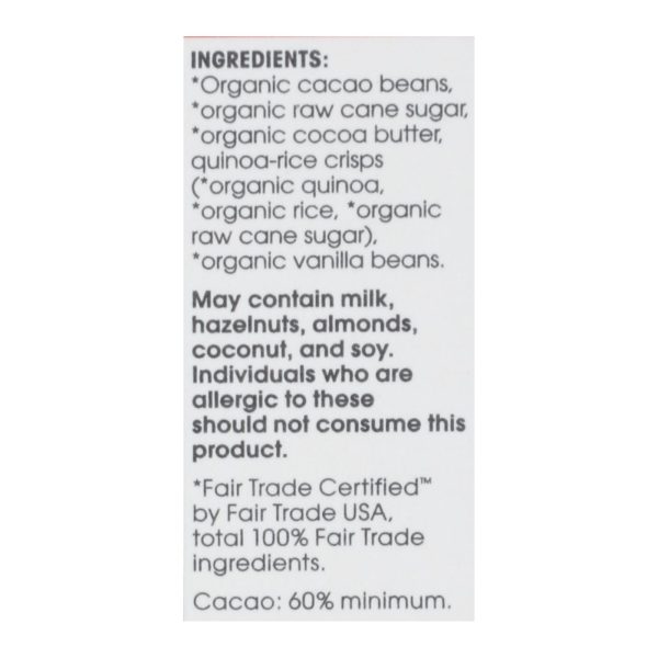 ingredients : organic cacao beans;organic raw cane sugar;organic cocoa butter;quinoa-rice crisps (*organic quinoa, *organic rice, *organic raw cane sugar);organic vanilla beans