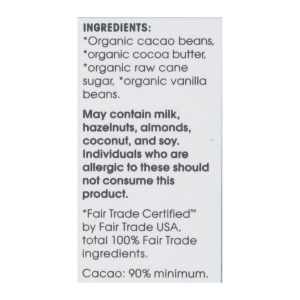 ingredients : organic cacao beans;organic cocoa butter;organic raw cane sugar;organic vanilla beans
