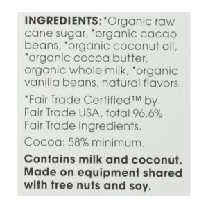 ingredients : organic raw cane sugar;organic cacao beans;organic coconut oil;organic cocoa butter;organic whole milk;organic vanilla beans;natural flavors