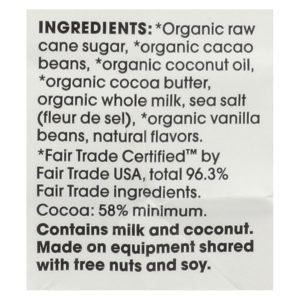 ingredients : organic raw cane sugar;organic cacao beans;organic coconut oil;organic cocoa butter;organic whole milk;sea salt (fleur de sel);organic vanilla beans;natural flavors