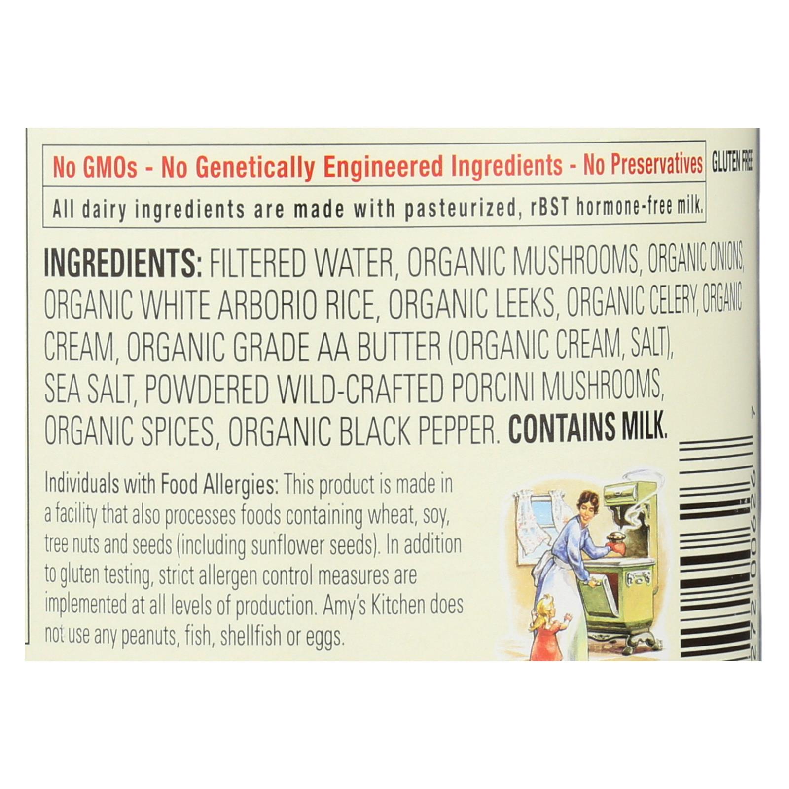 ingredients : filtered water;organic mushrooms;organic onions;organic white arborio rice;organic leeks;organic celery;organic cream;organic grade aa butter (organic cream, salt);sea salt;powdered wild-crafted porcini mushrooms;organic spices;organic black pepper