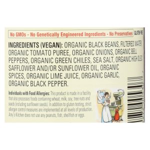 ingredients : organic black beans;filtered water;organic tomato puree;organic onions;organic bell peppers;organic green chiles;sea salt;organic high oleic safflower and/or sunflower oil;organic spices;organic lime juice;organic garlic;organic black pepper