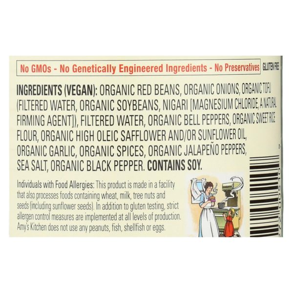 ingredients : (vegan): organic red beans, organic onions, tofu (filtered water, organic soybeans, nigari [magnesium chloride, a natural firming agent]), filtered water, organic bell peppers, organic sweet rice flour, organic high oleic safflower and/or sunflower oil, organic garlic, organic spices, organic jalapeno peppers, sea salt, organic black pepper