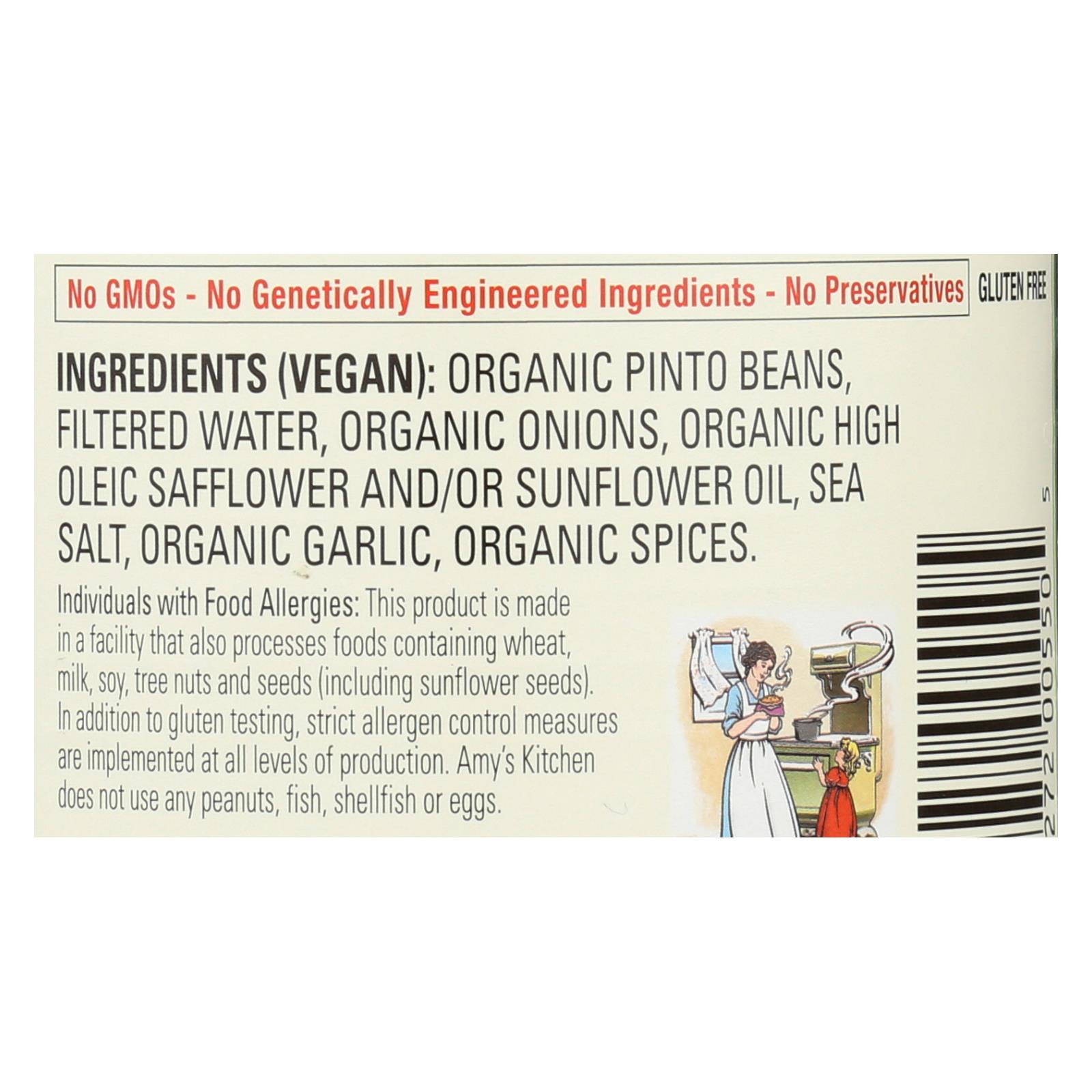 Amy’s organic vegetarian traditional refried beans is a cozy treat for those looking to reconnect with natural, simple ingredients. Great for your favorite mexican dish, our 15.4 oz. Refried beans are crafted with organic pinto beans and onions. Each can of gluten-free, all-vegan refried beans contains absolutely no preservatives while being packed with 6 grams of dietary fiber and 7 grams of protein per serving. Our beans are usda-certified organic, non-gmo and are packaged in a non-bpa lined can, so you can be sure that what you get is the real deal. See nutritional facts panel for allergens. Amy’s kitchen has grown beyond the berliner family’s wildest dreams, going from several family members pitching in anywhere they can, to a wonderful group of employees, farmers and suppliers. But no matter how big the company grows, one thing will always remain the same—the family spirit that permeates every decision made inside of amy’s kitchen.