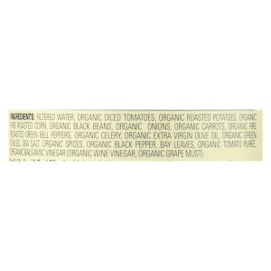 ingredients : filtered water;organic diced tomatoes;organic roasted potatoes;organic fire roasted corn;organic black beans;organic onions;organic carrots;organic fire roasted bell peppers;organic celery;organic extra virgin olive oil;organic green chiles;sea salt;organic spices;organic black pepper;bay leaves;organic tomato puree;organic balsamic vinegar (organic wine vinegar, organic grape must)