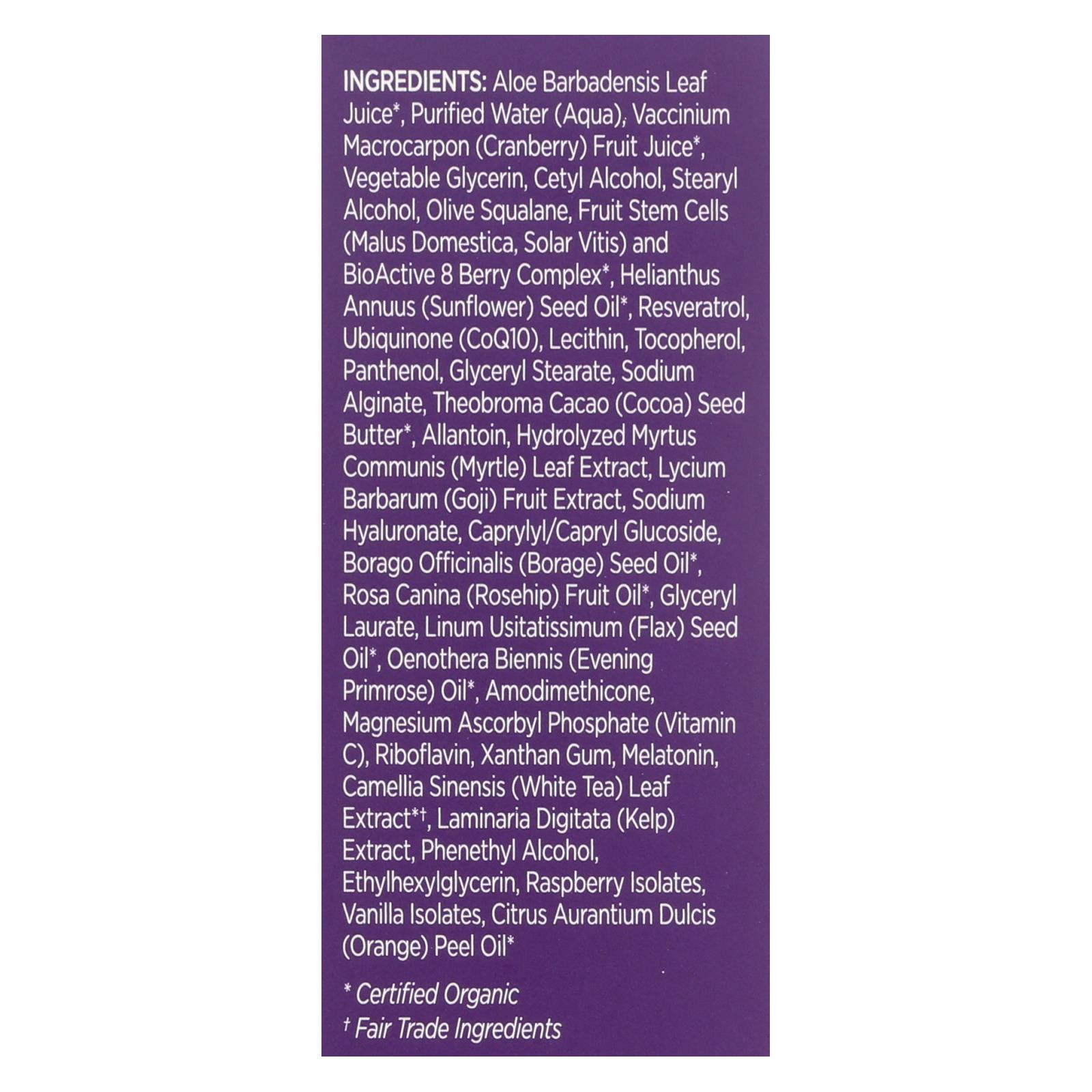ingredients : aloe barbadensis leaf juice;purified water;aqua;vaccinium macrocarpon;cranberry;fruit juice;vegetable glycerin;cetyl alcohol;stearyl alcohol;olive squalane;fruit stem cells;malus domestica;solar vitis;and bioactive 8 berry complex;helianthus annuus;sunflower;seed oil;resveratrol;ubiquinone;coq10;lecithin;tocopherol;panthenol;glyceryl stearate;sodium alginate;theobroma cacao;cocoa;seed butter;allantoin;hydrolyzed myrtus communis;myrtle;leaf extract;lycium barbarum;goji;fruit extract;sodium hyalur