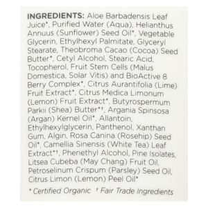 ingredients : aloe barbadensis leaf juice;purified water;aqua;helianthus annuus;sunflower;seed oil;vegetable glycerin;ethylhexyl palmitate;glyceryl stearate;theobroma cacao;cocoa;seed butter;cetyl alcohol;stearic acid;tocopherol;fruit stem cells;malus domestica;solar vitis;and bioactive 8 berry complex;citrus aurantifolia;lime;fruit extract;citrus medica limonum;lemon;butyrospermum parkii;shea;butter*†;argania spinsosa;argan;kernel oil;allantoin ethylhexylglycerin;panthenol;xanthan gum;algin;rosa canina;roseh