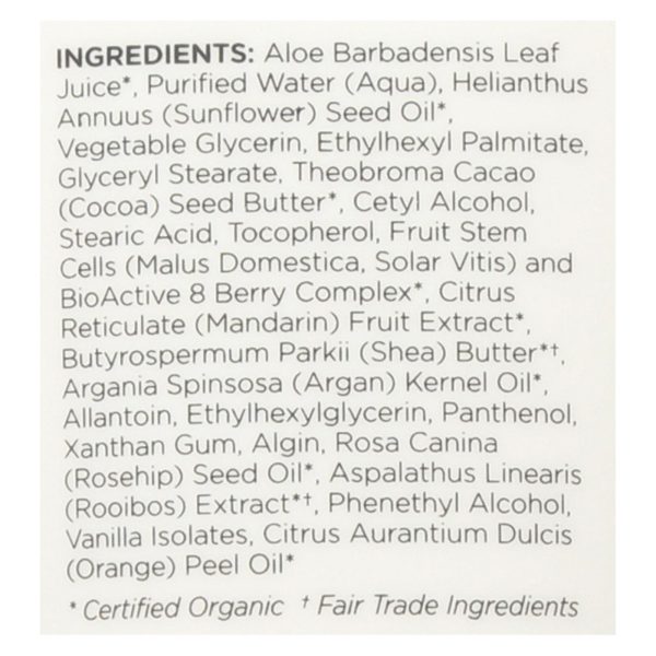 ingredients : aloe barbadensis leaf juice;purified water;aqua;helianthus annuus;sunflower;seed oil;vegetable glycerin;ethylhexyl palmitate;glyceryl stearate;theobroma cacao;cocoa;seed butter;cetyl alcohol;stearic acid;tocopherol;fruit stem cells;malus domestica;solar vitis;and bioactive 8 berry complex;citrus reticulate;mandarin;fruit extract;butyrospermum parkii;shea;butter*†;argania spinosa;argan;kernel oil;allantoin;ethylhexylglycerin;panthenol;xanthan gum;algin;rosa canina;rosehip;aspalathus linearis;rooi