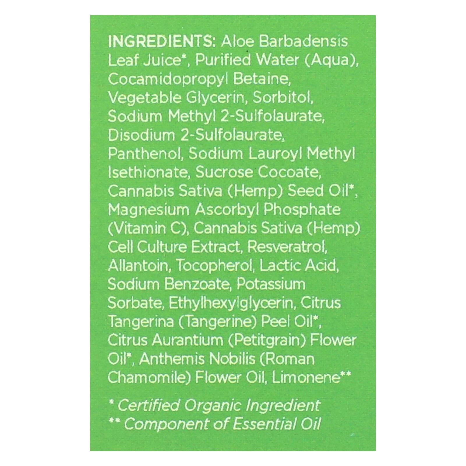 ingredients : aloe barbadensis leaf juice;purified water;aqua;cocamidopropyl betaine;vegetable glycerin;sorbitol;sodium methyl 2-sulfolaurate;disodium 2-sulfolaurate;panthenol;sodium lauroyl methyl isethionate;sucrose cocoate;cannabis sativa;hemp;seed oil;magnesium ascorbyl phosphate;vitamin c;cell culture extract;resveratrol;allantoin;tocopherol;lactic acid;sodium benzoate;potassium sorbate;ethylhexylglycerin;citrus tangerina;tangerine;peel oil;citrus aurantium;petitgrain;flower oil;anthemis nobilis;roman ch