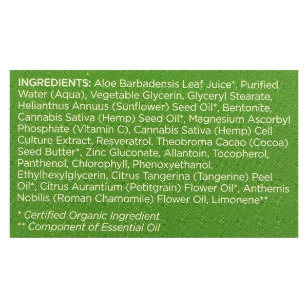 ingredients : aloe barbadensis leaf juice;purified water;aqua;vegetable glycerin;glyceryl stearate;helianthus annuus;sunflower;seed oil;bentonite;cannabis sativa;hemp;magnesium ascorbyl phosphate;vitamin c;cell culture extract;resveratrol;theobroma cacao;cocoa;seed butter;zinc gluconate;allantoin;tocopherol;panthenol;chlorophyll;phenoxyethanol;ethylhexylglycerin;citrus tangerina;tangerine;peel oil;citrus aurantium;petitgrain;flower oil;anthemis nobilis;roman chamomile;limonene