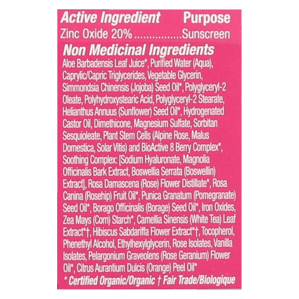 ingredients : active ingredient zinc oxide 20% purpose sunscreen non medicinal aloe barbadensis leaf juice;purified water;aqua;caprylic/capric triglycerides;vegetable glycerin;simmondsia chinensis;jojoba;seed oil;polyglyceryl-2 oleate;polyhydroxystearic acid;polyglyceryl-2 stearate;helianthus annus;sunflower;see oil;hydrogenated castor oil;dimethicone;magnesium sulfate;sorbitan sesquioleate;plant stem cells;alpine rose;malus domestica;solar vitis;and bioactive 8 berry complex;soothing complex: [sodium hyalur