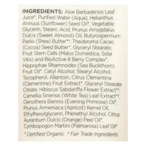 ingredients : aloe barbadensis leaf juice;purified water;aqua;helianthus annuus;sunflower;seed oil;vegetable glycerin;stearic acid;prunus amygdalus dulcis;sweet almond;oil;butyrospermum parkii;shea;butter*†;theobroma cacao;cocoa;seed butter;glyceryl stearate;fruit stem cells;malus domestica;solar vitis;and bioactive 8 berry complex;hippophae rhamnoides;sea buckthorn;fruit oil;cetyl alcohol;stearyl alcohol;tocopherol;allantoin;citrus clementina;clementine;fruit extract;glyceryl stearate citrate;hibiscus sabdar