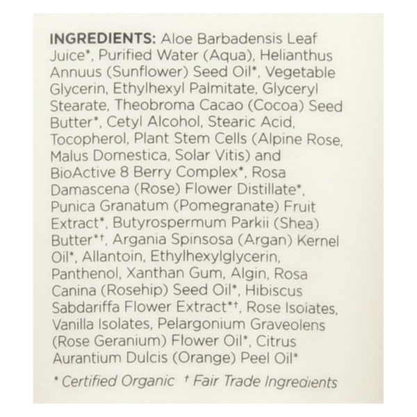 ingredients : aloe barbadensis leaf juice;purified water;aqua;helianthus annuus;sunflower;seed oil;vegetable glycerin;ethylhexyl palmitate;glyceryl stearate;theobroma cacao;cocoa;seed butter;cetyl alcohol;stearic acid;tocopherol;plant stem cells;alpine rose;malus domestica;solar vitis;and bioactive 8 berry complex;rosa damascena;rose;flower distillate;punica granatum;pomegranate;fruit extract;butyrospermum parkii;shea;butter*†;argania spinsosa;argan;kernel oil;allantoin;ethylhexylglycerin;pantothenol;xanthan