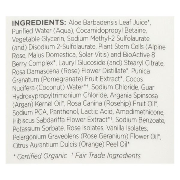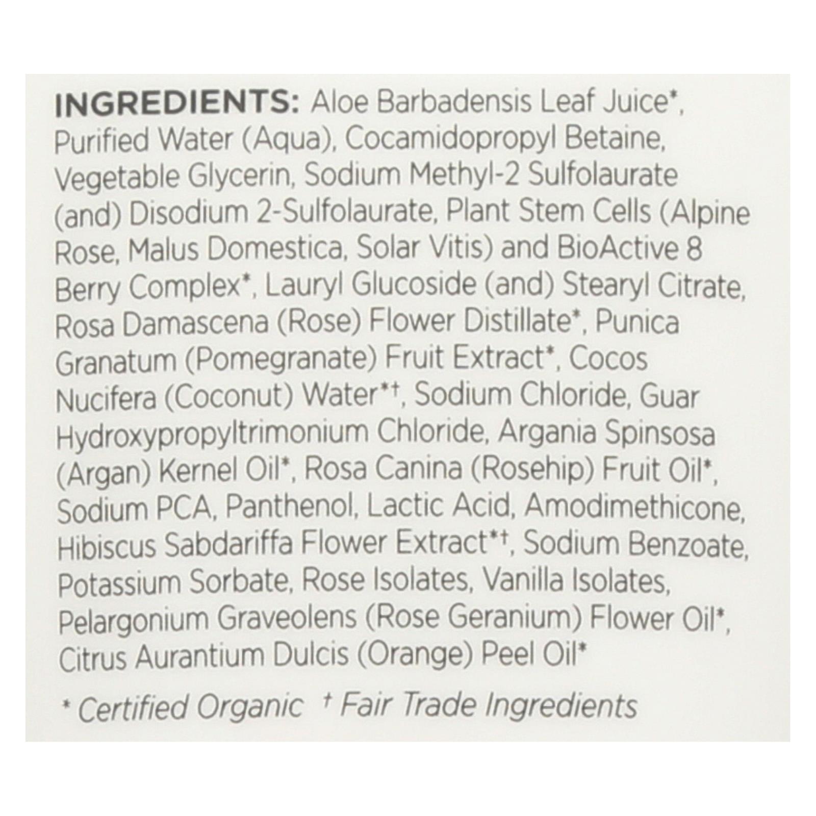 ingredients : aloe barbadensis leaf juice;purified water;aqua;cocamidopropyl betaine;vegetable glycerin;sodium methyl-2 sulfolaurate;and;disodium 2-sulfolaurate;plant stem cells;alpine rose;malus domestica;solar vitis;and bioactive 8 berry complex;lauryl glucoside;stearyl citrate;rosa damascena;rose;flower distillate;punica granatum;pomegranate;fruit extract;cocos nucifera;coconut;water*†;sodium chloride;guar hydroxypropyltrimonium chloride;argania spinosa;argan;kernel oil;rosa canina;rosehip;fruit oil;sodium