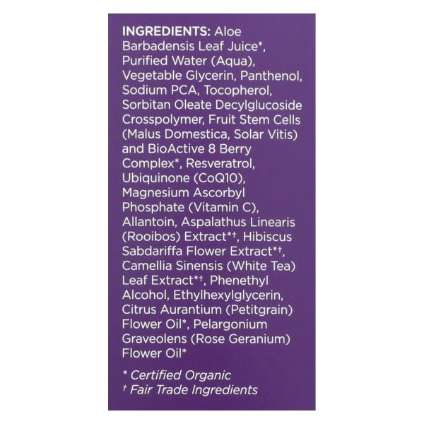 ingredients : aloe barbadensis leaf juice;purified water;aqua;vegetable glycerin;panthenol;sodium pca;tocopherol;sorbitan oleate decylglucoside crosspolymer;fruit stem cells;malus domestica;solar vitis;and bioactive 8 berry complex;resveratrol;ubiquinone;coq10;magnesium ascorbyl phosphate;vitamin c;allantoin;aspalathus linearis;rooibos;extract*†;hibiscus sabdariffa flower extract*†;camellia sinensis;white tea;leaf extract*†;phenethyl alcohol;ethylhexylglycerin;citrus aurantium;petitgrain;flower oil;pelargoniu
