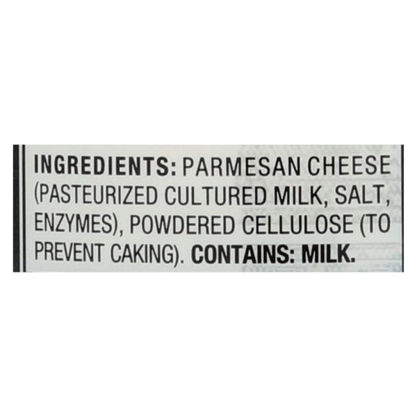 ingredients : parmesan cheese (rbgh-bst hormone free pasteurized cultured milk, salt, enzymes);anticake (powdered cellulose)