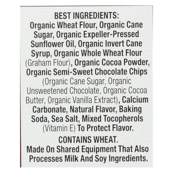 ingredients : best organic wheat flour;organic cane sugar;organic expeller-pressed sunflower oil;organic invert cane syrup;organic whole wheat flour (graham flour);organic cocoa powder;organic semi-sweet chocolate chips (organic unsweetened chocolate, organic cocoa butter, organic vanilla extract);calcium carbonate;natural flavor;baking soda;sea salt;mixed tocopherols (vitamin e) to protect flavor