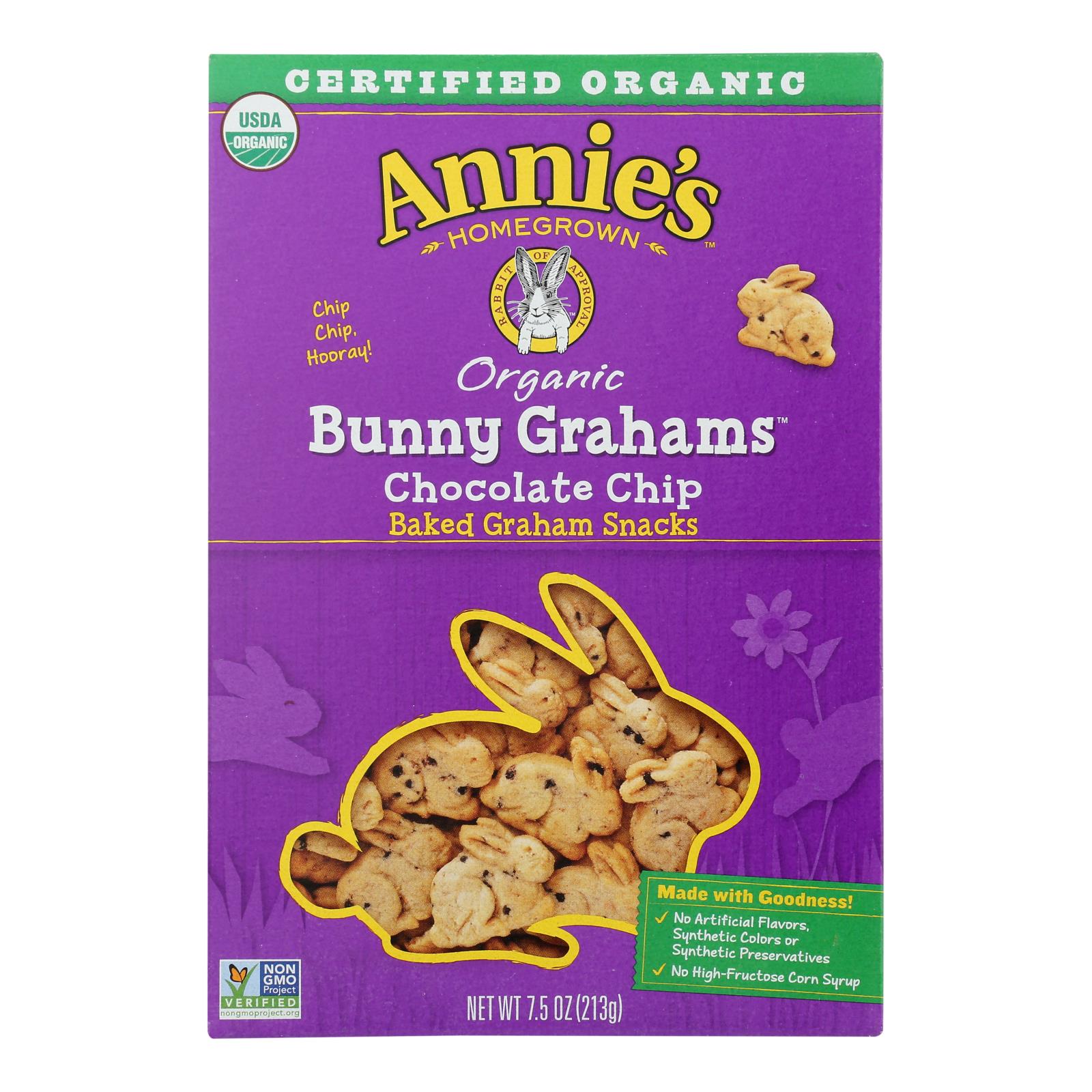 Annie’s homegrown organic bunny grahams in chocolate chip flavor are a delicious baked snack made with the goodness of whole grains. We partner with people and places we trust to grow the non-gmo project verified ingredients that make up our wholesome graham snacks. We include no artificial flavors, artificial colors or artificial preservatives. Each serving is only 130 calories and contains no high fructose corn syrup. Includes one 7.5 oz. Box of annie’s homegrown organic bunny grahams in chocolate chip flavor. See nutrition facts panel for allergens.