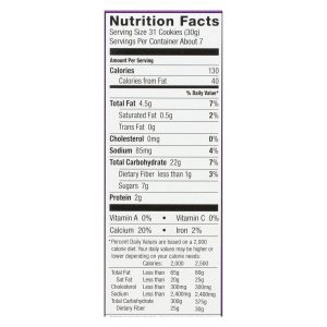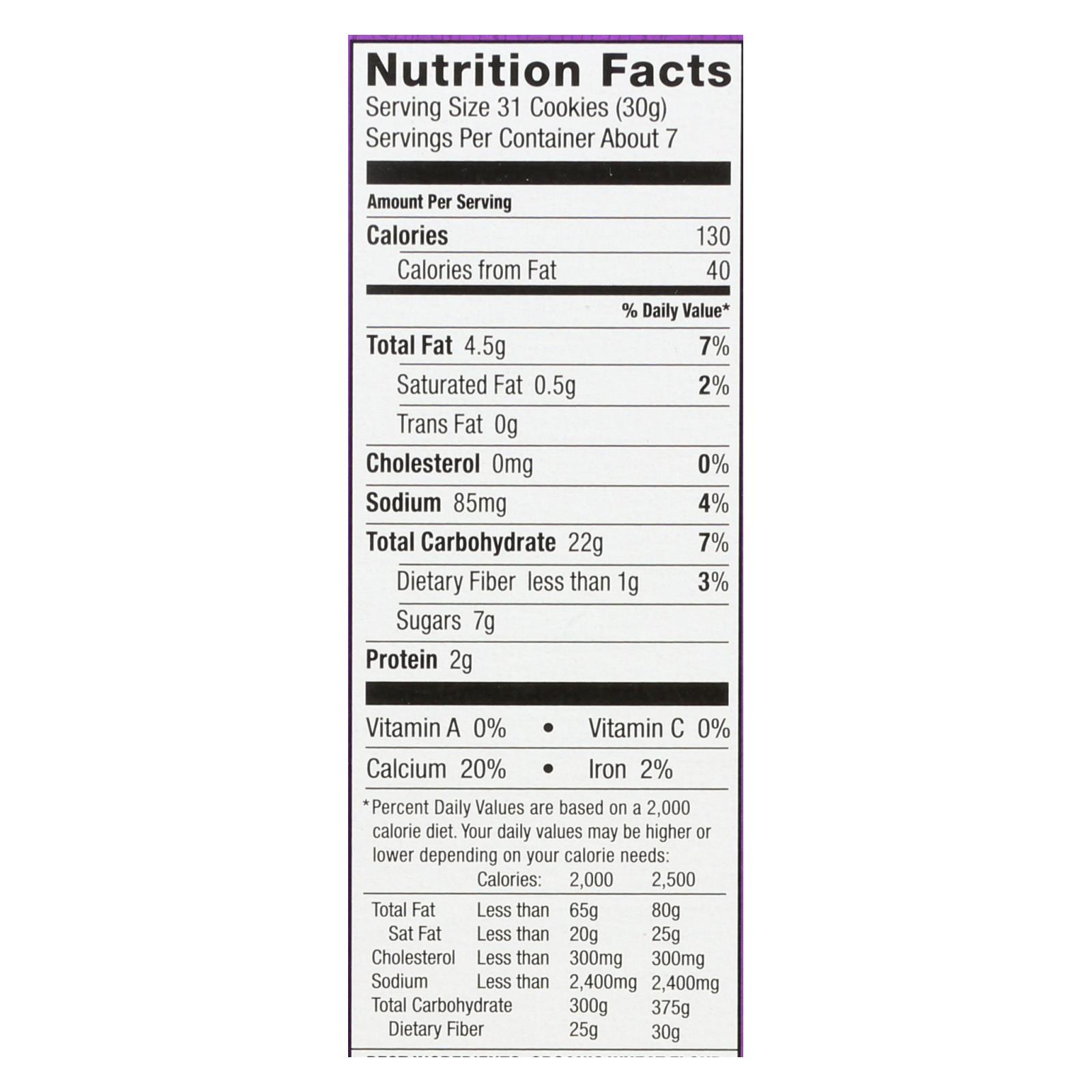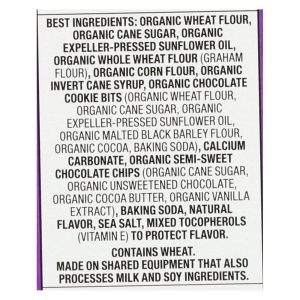 ingredients : organic wheat flour;organic cane sugar;organic expeller-pressed sunflower oil;organic corn flour;organic whole wheat flour;graham flour;organic invert cane syrup;organic chocolate cookie bits;organic sugar;organic malted black barley flour;organic cocoa;baking soda;calcium carbonate;organic semi-sweet chocolate chips;organic unsweetened chocolate;organic cocoa butter;organic vanilla extract;sea salt;natural flavor;mixed tocopherols;vitamin e;to protect flavor
