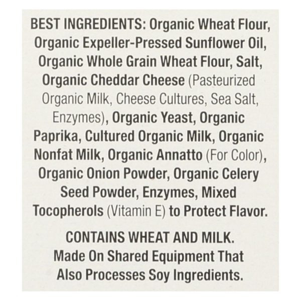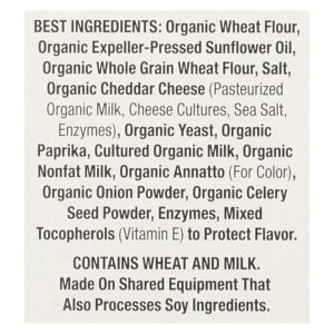 ingredients : organic wheat flour;organic expeller-pressed sunflower oil;organic whole grain wheat flour;salt;organic cheddar cheese;pasteurized organic milk;cheese cultures;sea salt;enzymes;organic yeast;organic paprika;cultured organic milk;organic nonfat milk;organic annatto;for color;organic onion powder;organic celery seed powder;mixed tocopherols;vitamin e;to protect flavor