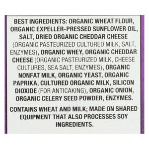 ingredients : best organic expeller-pressed sunflower oil;salt;dried organic cheddar cheese (organic pasteurized cultured milk, salt, h enzymes);organic whey;organic cheddar cheese (organic pasteurized milk, cheese cultures, sea salt, enzymes);organic nonfat milk;organic yeast;organic paprika;cultured organic milk;silicon dioxide (for anticaking);organic onion;organic celery seed powder;enzymes