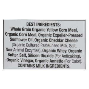 ingredients : whole grain organic yellow corn meal;organic corn meal;organic expeller-pressed sunflower oil;organic cheddar cheese;organic cultured pasteurized milk;salt;non-animal enzymes;organic whey;organic butter;silicon dioxide;for anticaking;organic vinegar;organic annatto;for color