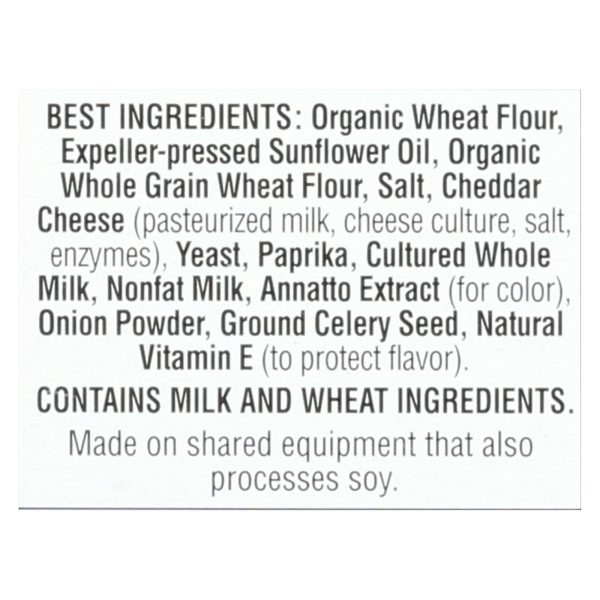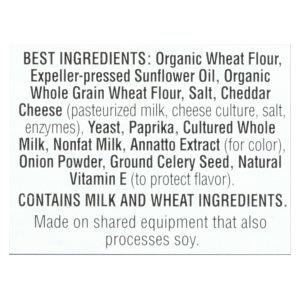 ingredients : best organic wheat flour;expeller-pressed sunflower oil;organic whole grain wheat flour;salt;cheddar cheese (pasteurized milk, cheese culture, salt, enzymes);yeast;paprika;cultured whole milk;nonfat milk;annatto extract (for color);onion powder;ground celery seed;natural vitamin e (to protect flavor)