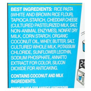 ingredients : best rice pasta;white and brown rice;tapioca starch;cheddar cheese;cultured pasteurized milk;salt;non-animal enzymes;nonfat dry milk;corn starch;organic coconut oil;whey;potassium chloride;sunflower lecithin;sodium phosphate;annatto extract for color;silicon dioxide for anticaking