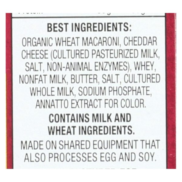 ingredients : organic wheat macaroni;cheddar cheese;cultured pasteurized milk;salt;non-animal enzymes;whey;nonfat milk;butter;cultured whole milk;sodium phosphate;annatto extract for color
